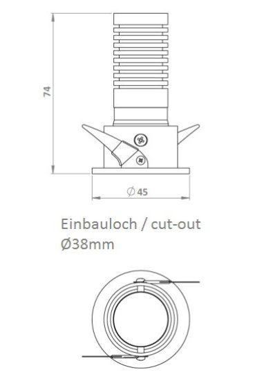 | Abmessungen: | Ø außen: 45 mm Deckenausschnitt: 38 mm Einbauhöhe: 74 mm |