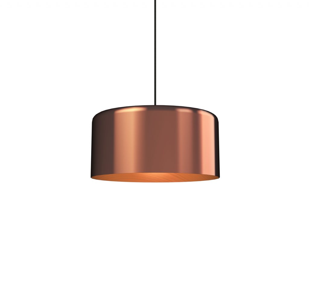 Die Lichtquelle der Pendelleuchte Tellus 1 befindet sich in einem soliden metallischen Reflektor, dessen Form und Farbe kundenspezifisch anpassbar ist.