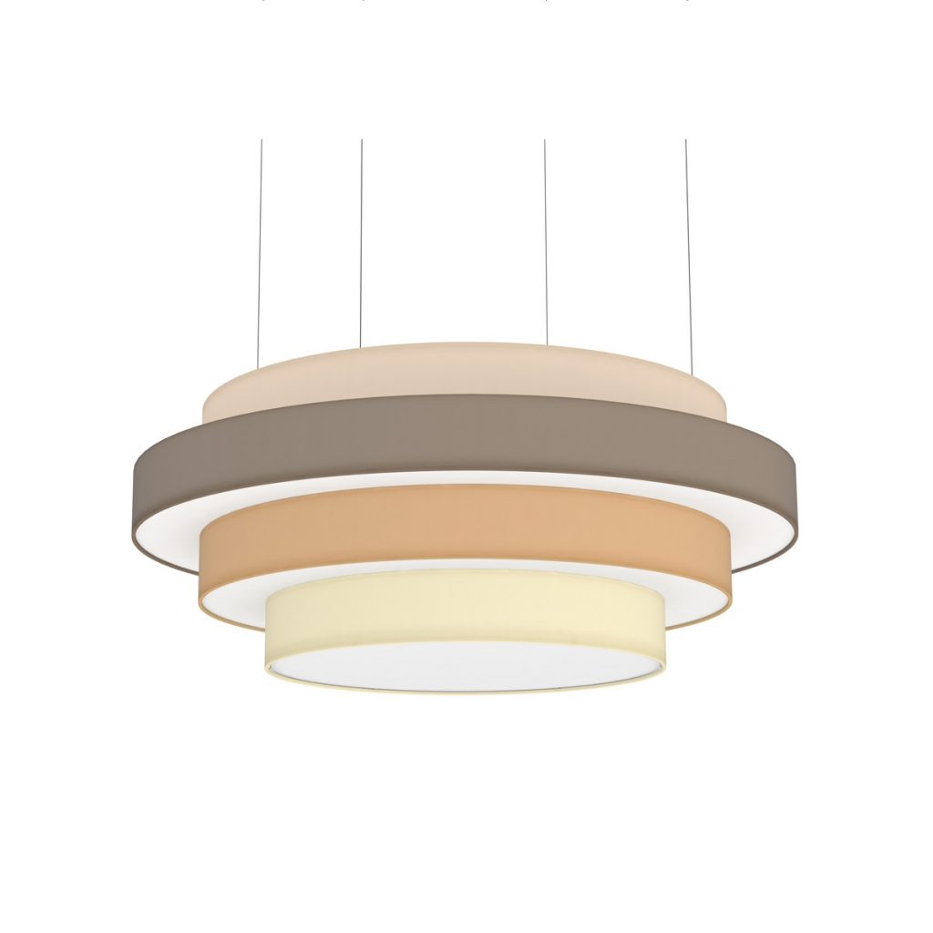 Die Deckenleuchte Paralu Pyramide wird von verschieden großen, runden Stoffschirmen geziert. All unsere Schirme lassen sich in Maß und Stoff gemäß Ihren Wünschen anpassen.