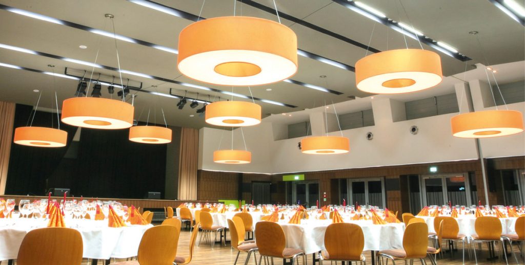 Ein Stoffschirm aus der hauseigenen Fertigung umhüllt die Leuchtmittel der Ringleuchte Donut. Individuell in Maß und Farbe gestaltbar, passt sich die Ringleuchte Donut Ihrem Projekt an und sorgt für ein angenehmes Lichtgefühl.