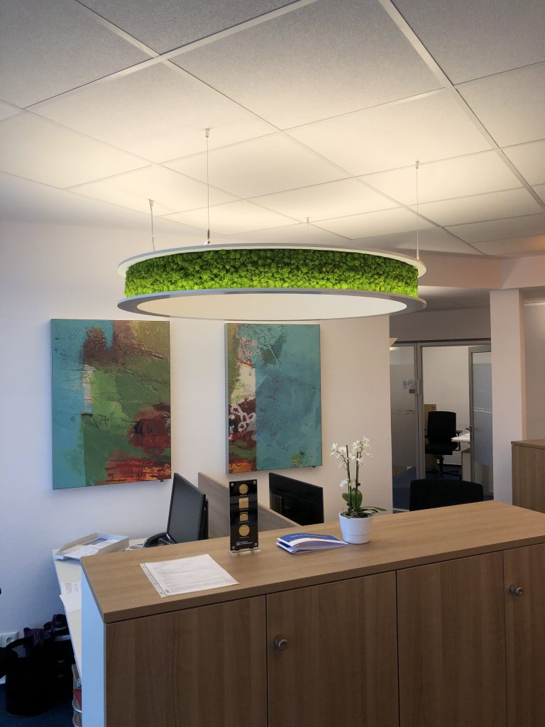 Kontakt mit der Natur reduziert unser Stressempfinden signifikant und erhöht unsere Kreativität – in einer natürlichen Umgebung fühlen wir Menschen uns nachweislich wohler, gesünder und produktiver. Unsere Moos-Ringleuchte Nova punktet mit ihrem eindrucksvollen und außergewöhnlichen Erscheinungsbild. Hier ist Eleganz mit Technik zu einer gemeinsamen Einheit verschmolzen. Die Moosleuchte verspricht wohltuende Atmosphäre, akustische Wirksamkeit für mehr Ruhe und bei Bedarf eine zusätzliche indirekte und effiziente Grundbeleuchtung.