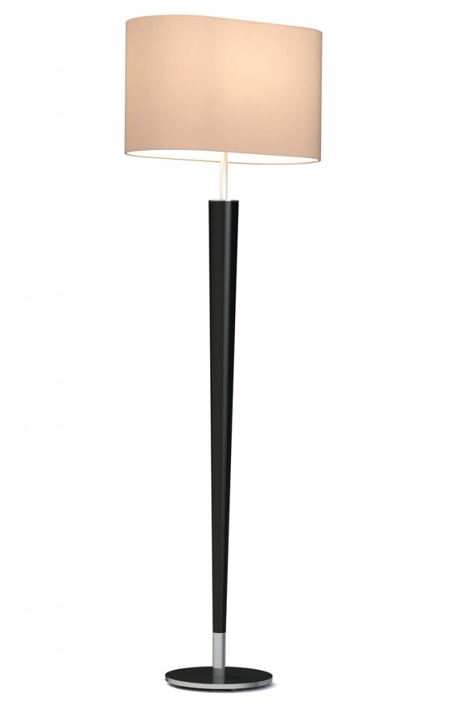 Ein ovaler Stoffschirm krönt die Stehleuchte Alvo 153. Maß und Farbe können je nach Kundenwunsch angepasst werden.