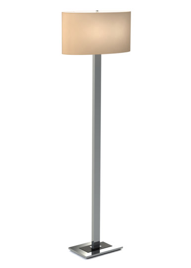 Ein ovaler Stoffschirm aus der hauseigenen Fertigung umhüllt das Leuchtmittel der Stehleuchte Karus 156. Unsere Stoffschirme sind individuell in Maß und Farbe gestaltbar.