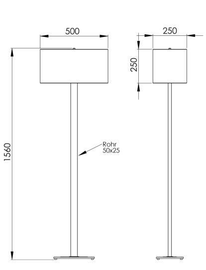 Der in Höhe und Oberflächenfarbe variabel gestaltbare Schaft ist aus einem eckigen Rohr gefertigt. Bei metallischen Oberflächen sind RAL Farben oder spezielle Oberflächen wie Chrom oder Edelstahloptik möglich.