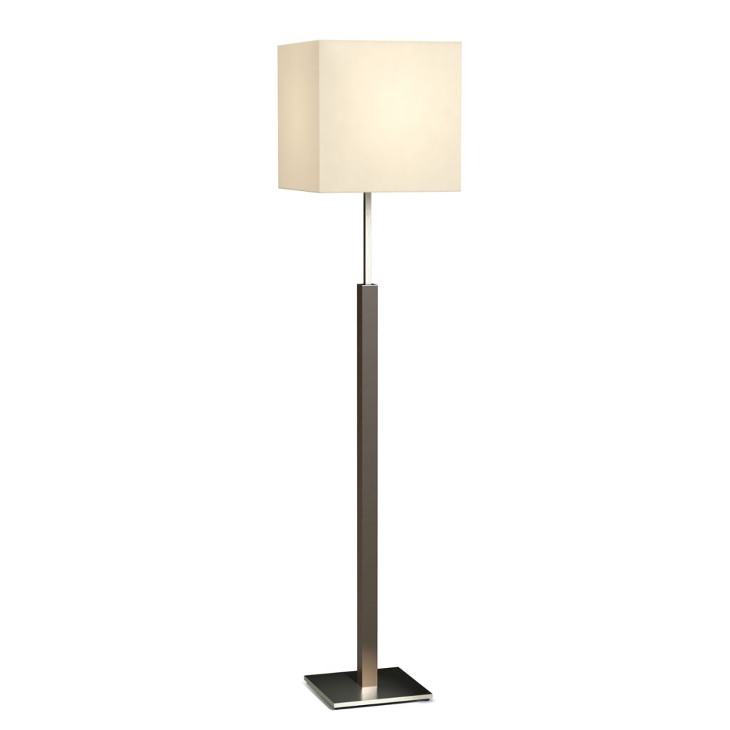 Ein eckiger Stoffschirm krönt die Stehleuchte Quadro H 160. Maß und Farbe können je nach Kundenwunsch angepasst werden.
