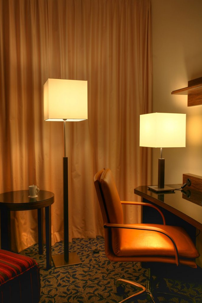 Um das Gesamtbild abzurunden, wird die eckige Form des Schafts und des Schirms in der Form des Leuchtenfußes aufgenommen.