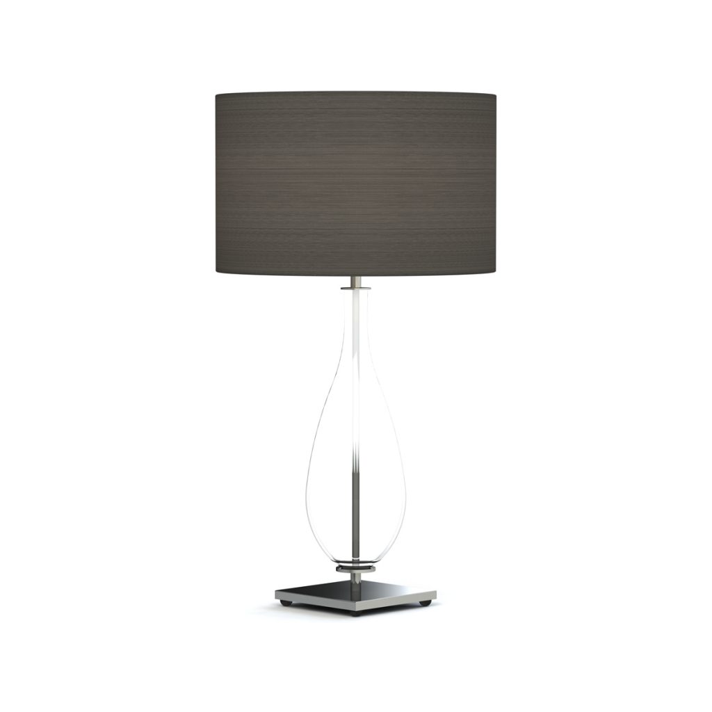 Ein runder Stoffschirm krönt die Tischleuchte Venus 64. Maß und Farbe können je nach Kundenwunsch angepasst werden.