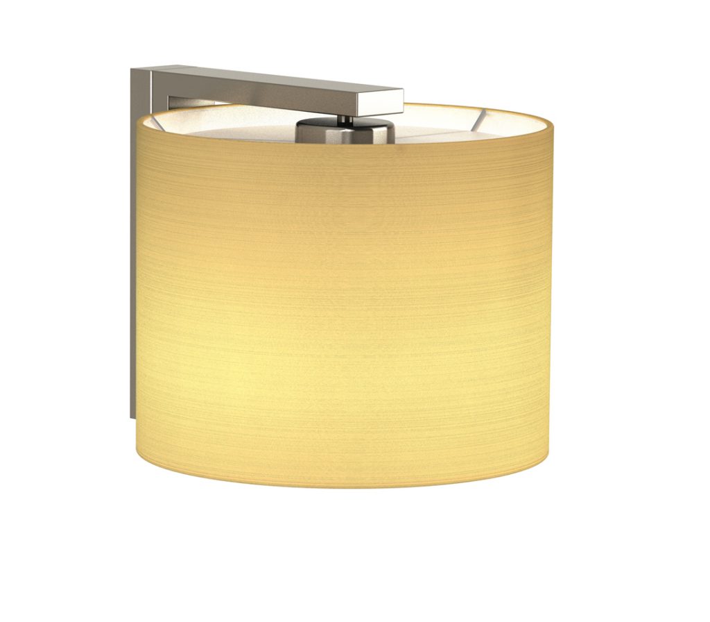 Ein runder Stoffschirm krönt die Wandleuchte Doxa 30. Maß und Farbe können je nach Kundenwunsch angepasst werden.